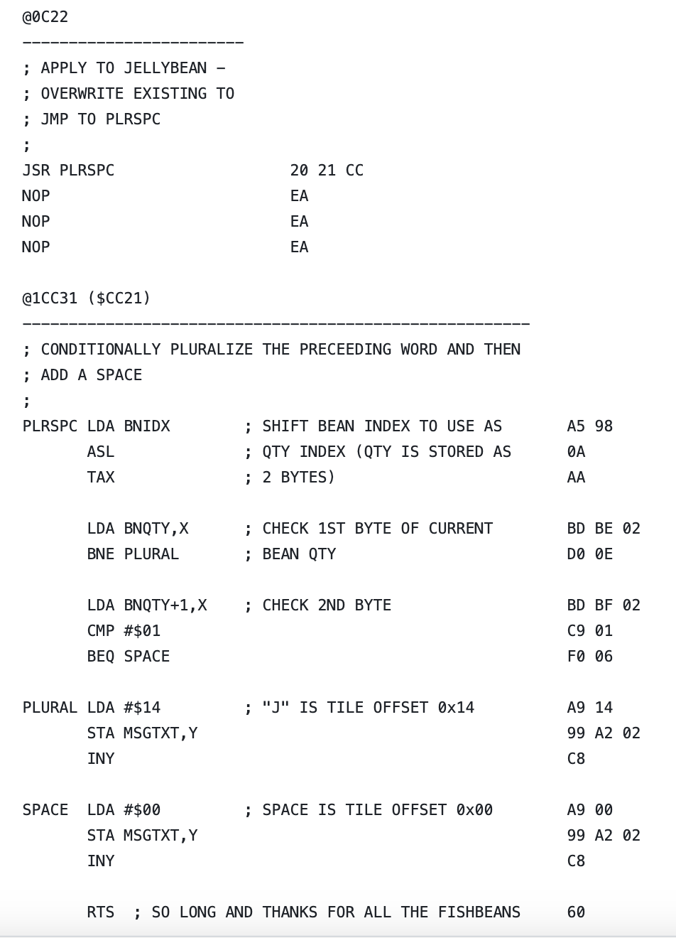 Tamen, romhakada tradukado ne nur temas pri anstataŭigo de teksto kaj grafikaĵoj. Foje necesas modifi la program-instrukciojn por ŝanĝi la videoludon. Ekzemple, en A Boy and His Blob, la plurala sufikso estis programe aldonita surbaze je la kvanto de ĵeleeroj en la stoko. Mi devis trovi la specifajn program-instrukciojn, verki mian propran kodon por prezenti la ĝustan formon en Esperanto al kaj la adjektivo kaj substantivo, kaj poste serĉi liberan spacon por la kodo kaj anstataŭigi la originalajn instrukciojn. Kaj en Bubble Bobble, mi eĉ kreis proprajn Esperanto-temajn nivelojn.